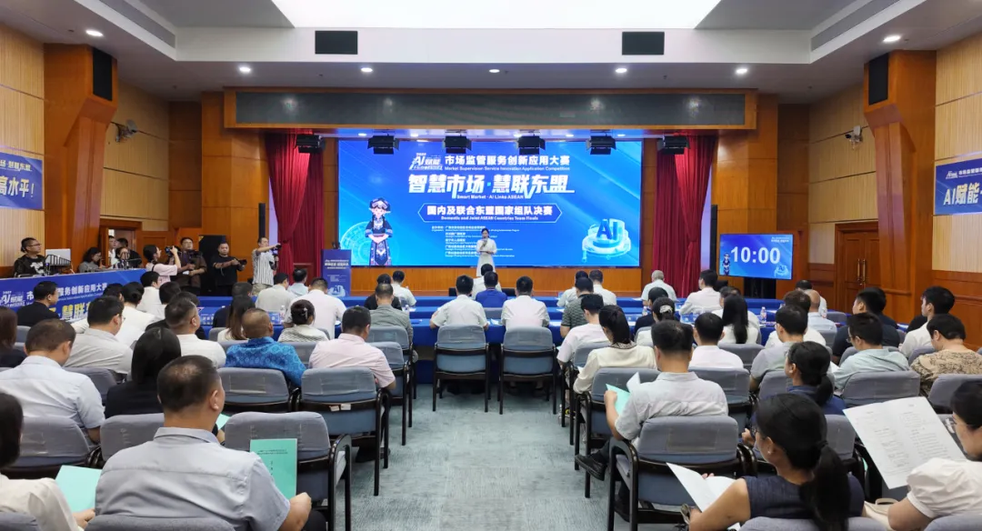 大赛旨在汇聚中国—东盟的顶尖智慧,推动人工智能技术与市场监管深度融合,提升监管与服务能力,助力中国—东盟区域经济高质量发展。赛事自启动以来受到广泛关注,全国报名队伍超过1300支,东盟国家参赛队伍达100余支。经初筛、初评,40支团队进入决赛,其中25支队伍参加了当天“国内及联合东盟国家组队”决赛的现场竞演,围绕人工智能在食品安全、信用监管、知识产权保护、特种设备监管等领域创新应用展开角逐,展现中国—东盟在数字监管领域的深度合作与创新活力。