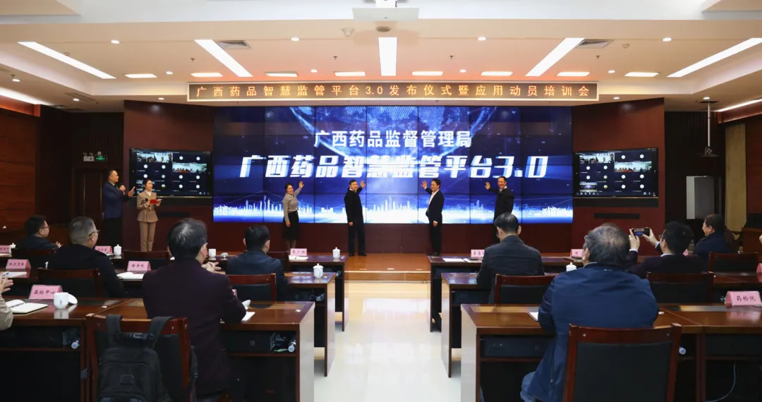 2025年12月31日下午,自治区药监局召开广西药品智慧监管平台3.0发布仪式暨应用动员培训会,自治区药监局党组书记、局长李勇强出席发布仪式、宣布平台上线并做平台应用动员讲话,局党组成员、副局长韦广辉、万秋、沈宏睿出席活动共同启动平台发布。