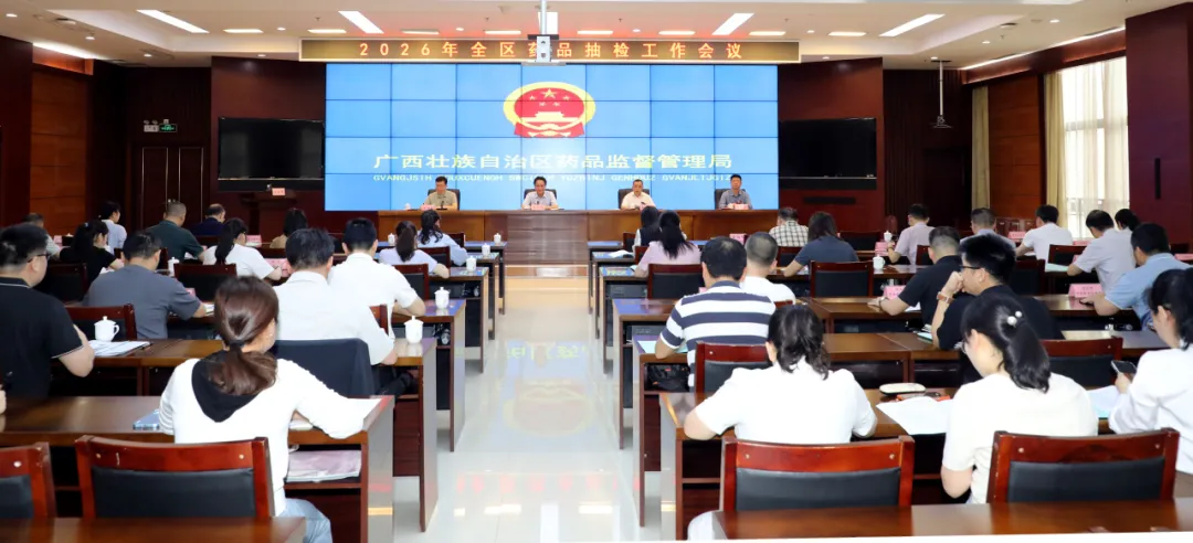 4月9日,广西药监局在南宁召开2026年全区药品抽检工作会议,贯彻落实国家药品抽检工作会议精神及2026年全区市场监管(药品监管)工作会议部署,总结2025年全区药品抽检工作成效,分析当前形势,全面部署2026年药品抽检重点工作任务。局党组成员、副局长韦广辉出席会议并讲话。