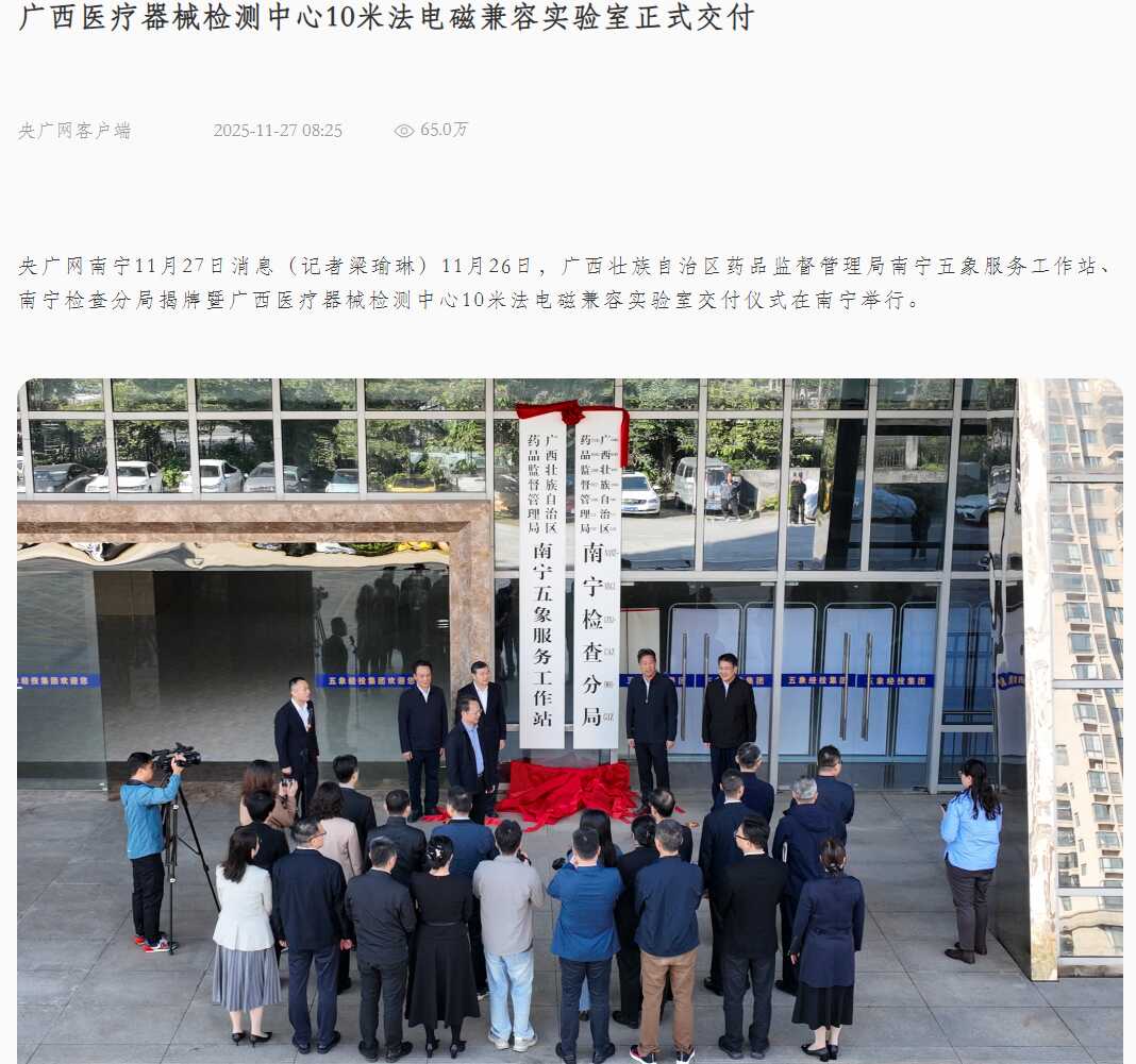 央广网南宁11月27日消息(记者梁瑜琳)11月26日,广西壮族自治区药品监督管理局南宁五象服务工作站、南宁检查分局揭牌暨广西医疗器械检测中心10米法电磁兼容实验室交付仪式在南宁举行。