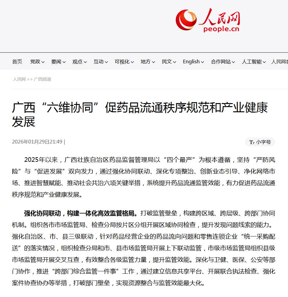 2025年以来,广西壮族自治区药品监督管理局以“四个最严”为根本遵循,坚持“严防风险”与“促进发展”双向发力,通过强化协同联动、深化专项整治、创新业态引导、净化网络市场、推进智慧赋能、推动社会共治六项关键举措,系统提升药品流通监管效能,有力促进药品流通秩序规范和产业健康发展。