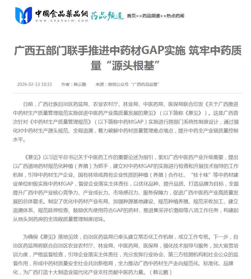 日前,广西壮族自治区药监局、农业农村厅、林业局、中医药局、医保局联合印发《关于广西推进中药材生产质量管理规范实施促进中医药产业高质量发展的意见》(以下简称《意见》)。这是广西首次针对《中药材生产质量管理规范》(以下简称中药材GAP)实施进行跨部门系统性制度设计,通过强化对中药材生产源头规范、全程追溯,着力破解中药材质量管理难点堵点,提升中药全产业链质量控制水平。