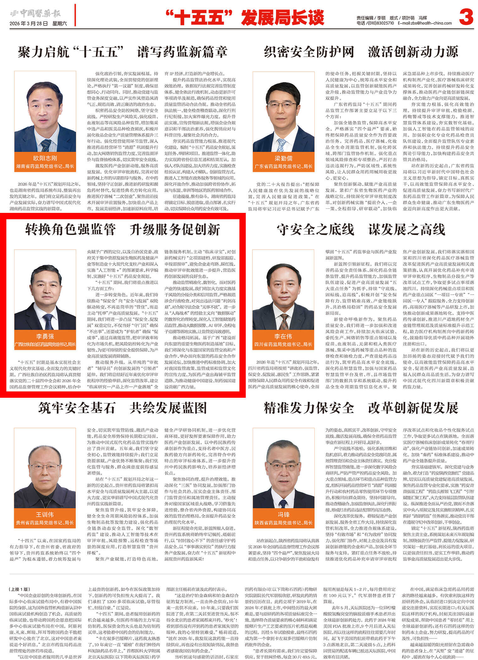 进一步转变角色。近年来,我们持续推动“保安全”向“安全与发展”双轮驱动转变,不再是简单的“管住”,而是主动“托举”产业高质量发展。“十五五”期间,我们将进一步凸显“保安全、促发展”双重定位,不仅当好“守门员”确保“不出事”,还要成为“护航者”确保“促成事”,通过高效能监管,把审评效率转化为市场先机,把风险防控转化为产业韧性,为更可持续的安全提供保障,为产业高质量发展清障铺路。