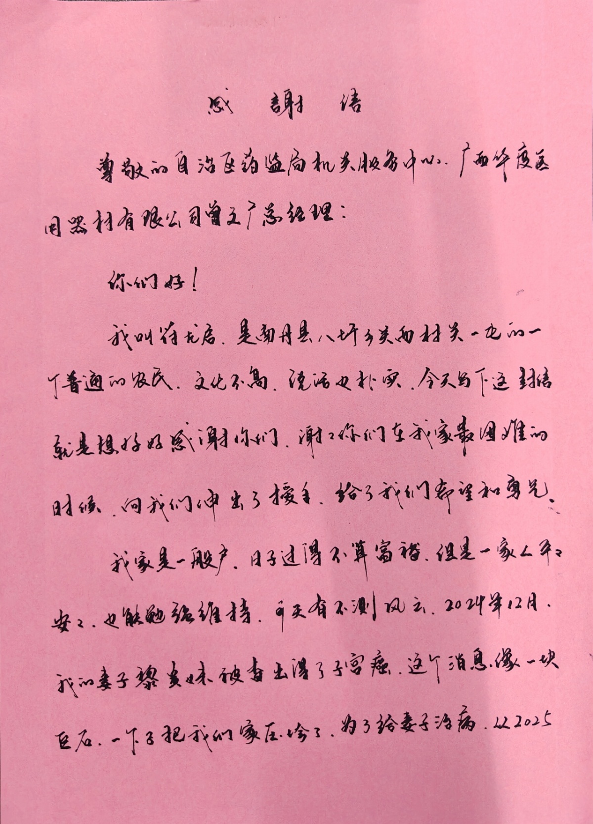近日,南丹县八圩瑶族乡关西村关一屯村民符龙启专程来到村委会,送上一封手写感谢信,向自治区药品监督管理局机关服务中心、广西华度医用器材有限公司表达深深谢意。